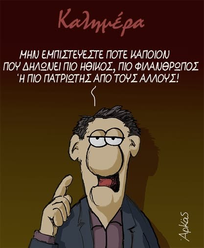 arkas.filantroposΜας ζάλισαν με τη συνέντευξη Σαμαρά.  Είπε τούτο είπε εκείνο είπε το άλλο. Λες και διαφέρει από τον σύζυγο της Μαρέβας. Εγώ θα συνεχίσω να γράφω, ότι το μόνο προσόν που εκτιμώ σε έναν πωλητικό είναι το ήθος.  Και ο Αντώνης δεν έχει. Δεν θα θυμίσω την πορδυπουργική εντολή στη Δικαιοσύνη «πες στον ψηλό, τον Παναθηναϊκάκια οι επόμενοι τρεις που θα πάνε να τους γ…».